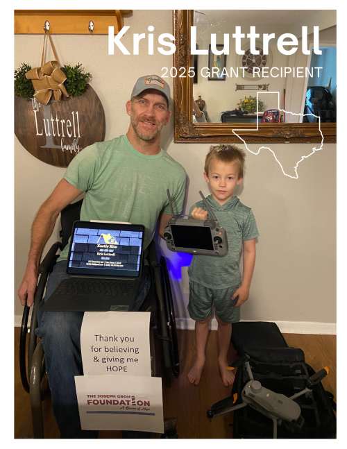 With support from The Joseph Groh Foundation, Kris has received essential tools to launch this next chapter, including a Samsung tablet, DJI drone, and supporting software. These resources will allow him to manage job sites more efficiently, communicate clearly with clients, and deliver high-quality services, all while reducing the physical demands on his body.