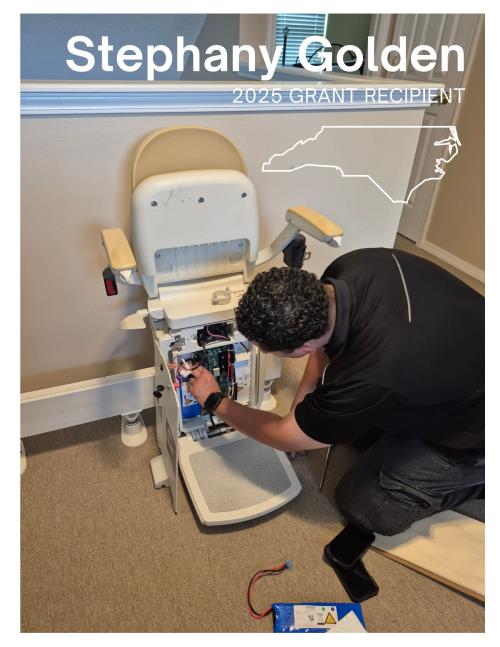 Their primary bedroom remained on the second floor of their home, and a stair lift allowed Stephany to continue accessing the space safely. That lift became essential to their routine. Earlier this summer, however, it failed and required repairs well beyond what the family could afford. When the Goldens reached out once more, we stepped in to assist. Through the continued support of our donors, we were able to fund the repairs needed to get the stairlift back in working order, restoring safe access to their home and easing a significant worry for the family.