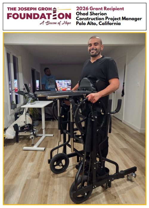 Ohad learned about The Joseph Groh Foundation through an online search while seeking support to continue his recovery and regain strength. According to Ohad, “The funding will greatly enhance my physical fitness and improve my emotional well-being from not being able to manage construction projects,” providing meaningful progress in both his physical health and daily independence. With the help of the Foundation’s donors, he received a Grandstand 3 III MSS Standing Frame.